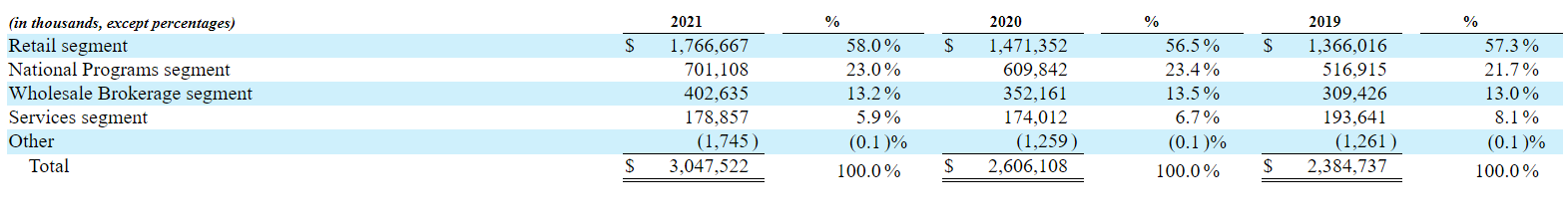 Our business is divided into four reportable segments: (i) the Retail segment, (ii) the National Programs segment, (iii) the Wholesale Brokerage segment and (iv) the Services segment.