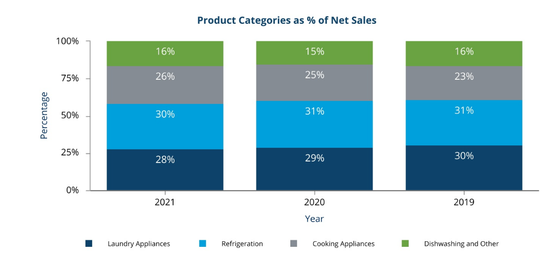 Additionally, the Company has a robust portfolio of small domestic appliances, including the KitchenAid stand mixer. Prior to the divestiture of our Embraco business on July 1, 2019, we also produced compressors for refrigeration systems. The following chart provides the percentage of net sales for each of our product categories which accounted for 10% or more of our consolidated net sales over the last three years:
