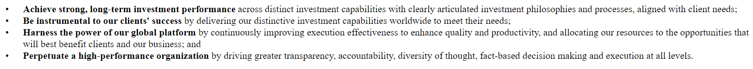 We believe one of Invesco's greatest strengths is our separate, distinct investment teams in multiple markets across the globe. A key focus of our business is fostering a strong investment culture and providing the support that enables our investment teams to maintain well-performing investment capabilities. We believe the ability to leverage the capabilities of our investment teams to help clients across the globe achieve their investment objectives is a significant differentiator for our firm.